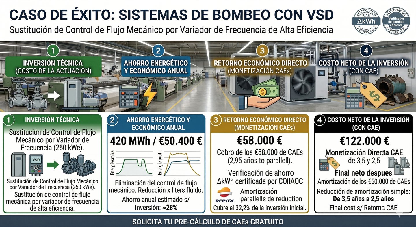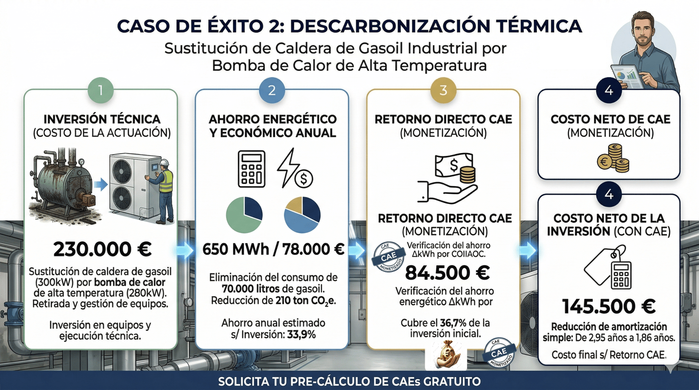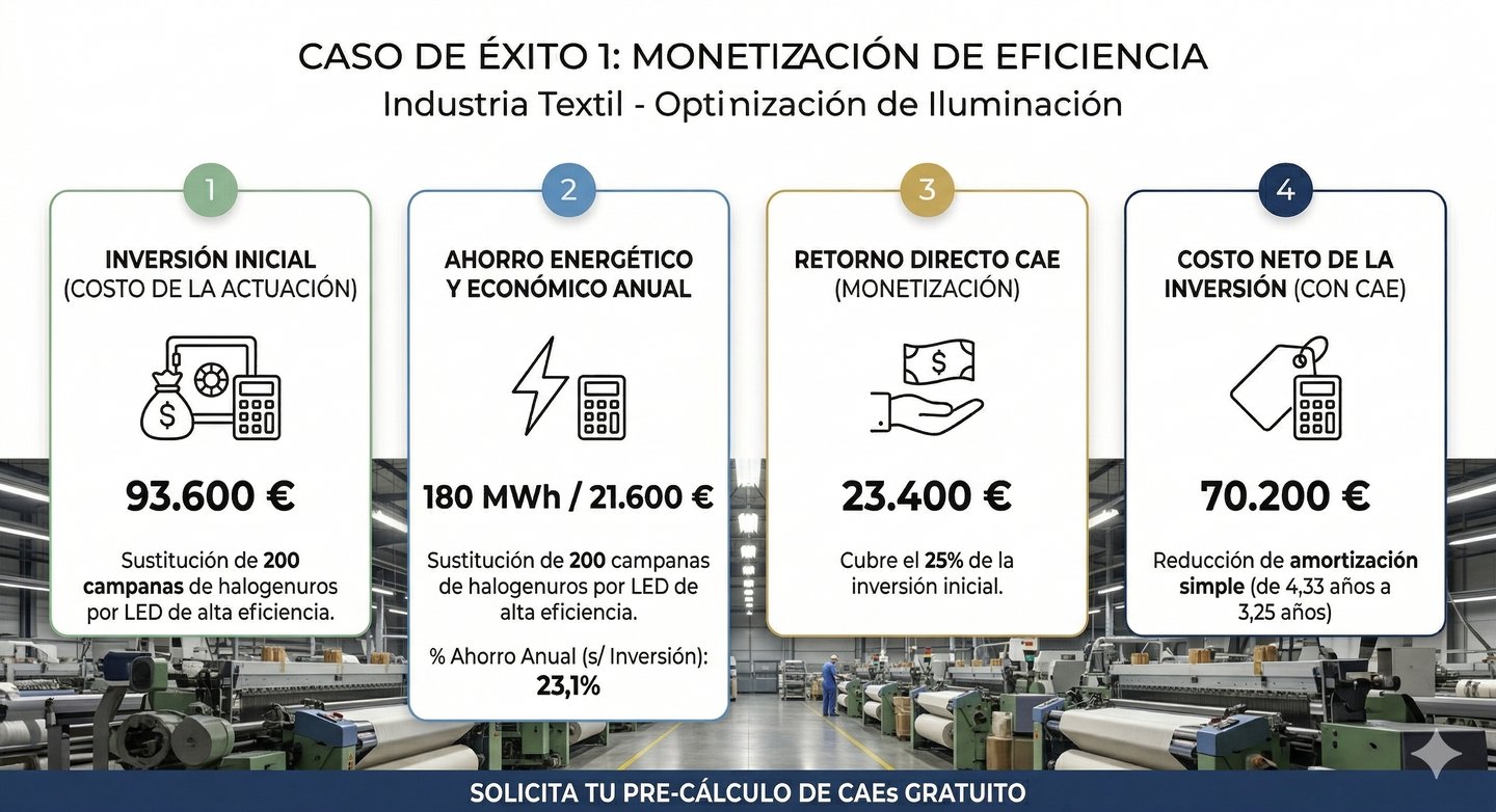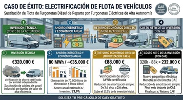 Convertimos el ahorro certificado en valor económico para el cliente, reduciendo costes operativos y generando un retorno adicional mediante la gestión de CAEs.